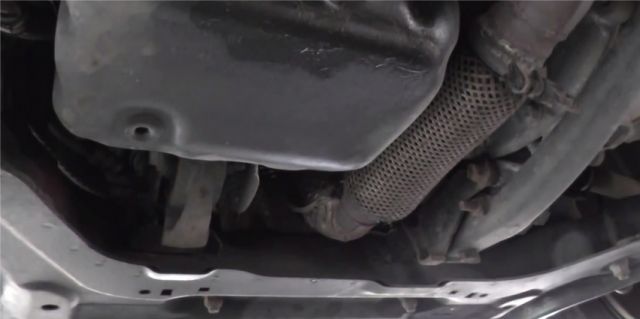 - Со стороны днища открутите поддон, если автомобиль им оборудован с завода, и приступайте к очистке поверхности агрегата вокруг сливной пробки. Такая процедура является обязательной, предусматривает профилактику попадания в систему грязевых отложений.