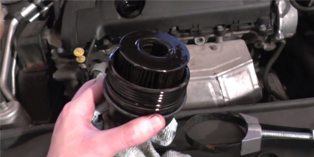Замена масляного фильтра производится из под капота. Надо ослабить затяжку крышки масляного фильтра ключом/головкой «на 27», открутить крышку от руки и снять ее, вместе фильтрующим элементом и резинкой. Затем нужно поменять картридж и уплотнительное кольцо, смазав резинку свежим маслом. Установить все в сборе обратно.