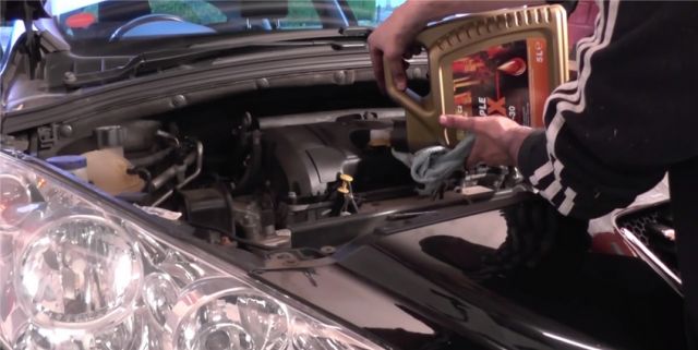 Убедившись, что сливная пробка и масляный фильтр закручены, можно заливать новое масло. Можно лить не все сразу, и, не долив 300-400 мл, закрутить крышку и запустить двигатель, дав ему поработать несколько минут. Заглушив мотор, надо выждать минут 5-10, пока масло стекает обратно в поддон, после чего проверить уровень масла по щупу и долить столько, чтобы масло было ближе к верхней метке.
