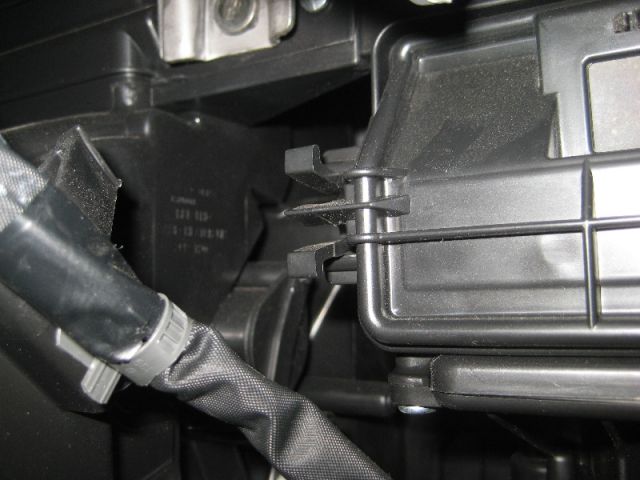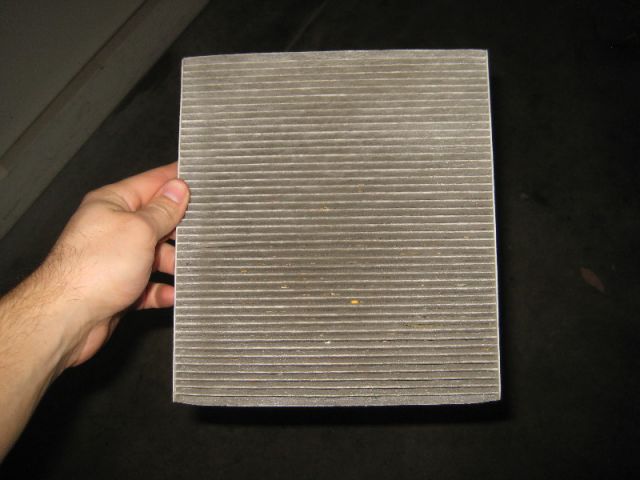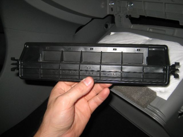 Теперь есть доступ к корпусу кондиционера и крышке салонного фильтра. Она крепится парой фиксаторов по краям, которые надо сжать, чтобы снять крышку. После этого можно вытащить старый салонный фильтр и осмотреть.